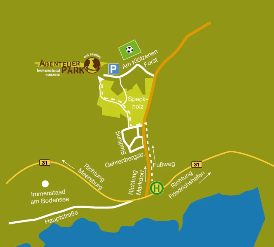 Bitte gib in dein Navigationssystem entweder „Abenteuerpark Immenstaad“ oder den Straßennamen „Ziegelei, 88090 Immenstaad“ ein.